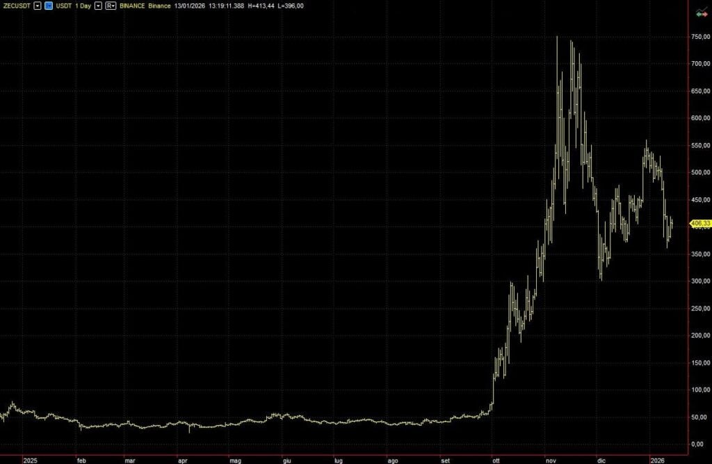 Ancora più eclatante è stato il caso di Zcash, che ha registrato una performance fuori scala, con un rialzo superiore all’808% su base annua. Un movimento che ha sorpreso il mercato e che, pur partendo da livelli molto depressi, ha dimostrato come anche in un anno complessivamente negativo possano emergere singoli casi di forza estrema.
