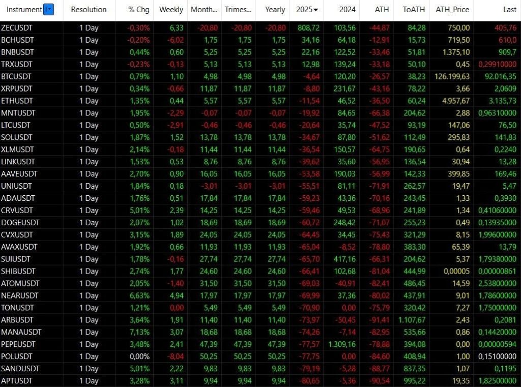 Figura 1 – Classifica delle principali criptovalute nel 2025 per rendimento: Zcash in testa con +808%, Bitcoin ed Ethereum in calo, bene BNB, TRX e BCH.