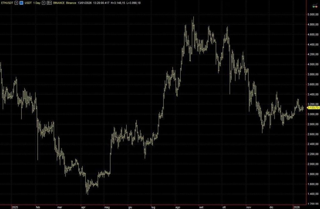 Figura 3 – Performance di Ethereum nel 2025: prezzo in calo nonostante lo sviluppo strutturale.